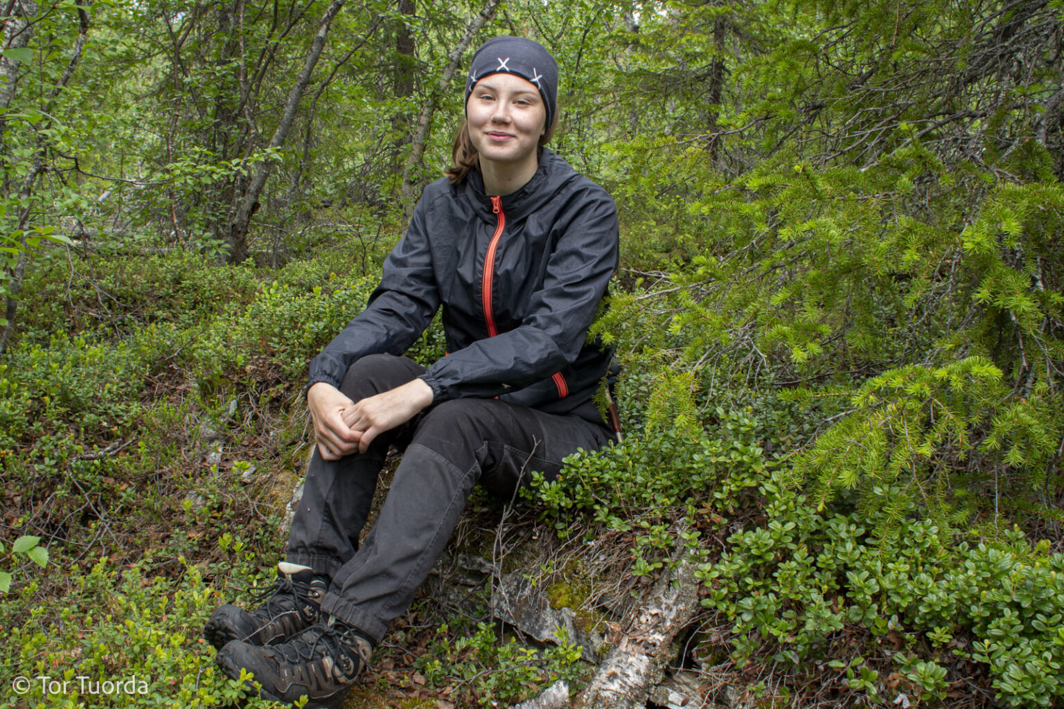 Inläggsbilden: Dotter Astrid står och ser fundersam ut på ett av hundratats försvarsarbeten på berget Ruovddevárre.
