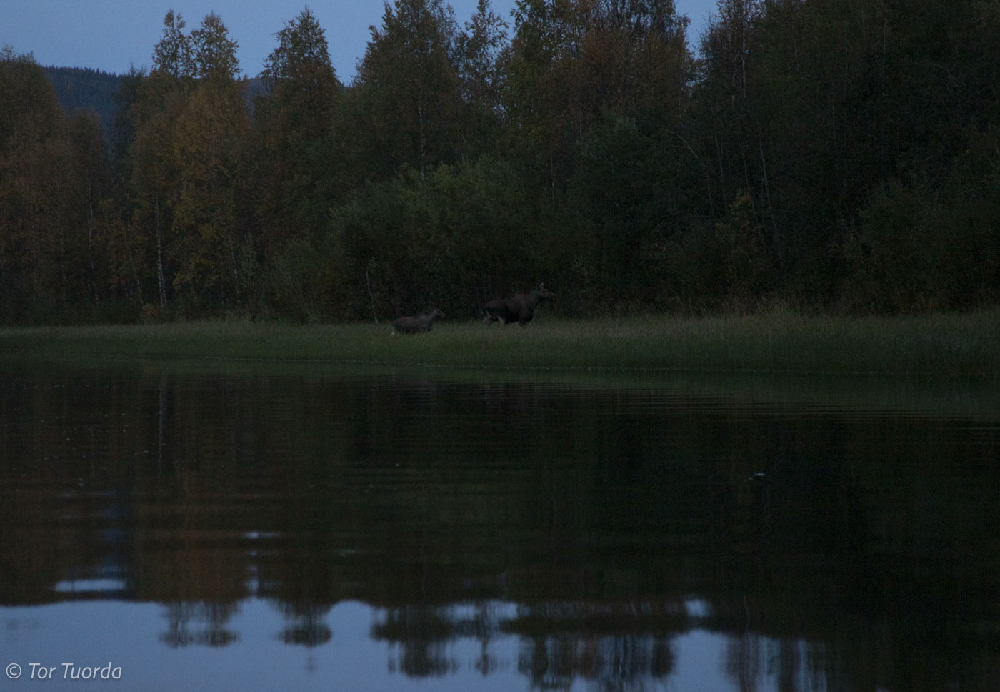 Vi fortsätter efter Darreädno. I Nyängaggan stannar vi till och glider med strömmen. Nils kastar och kastar, men ingenting. Nu är det riktigt murrigt och knappt värt något mer fiskeförsök. På Löjsanden står en älgko med kalv och dricker. De rör sig sakta in mot skogen när vi kommer. Trygga. De kanske vet att de inte är jaktbart vilt för de kvikkjokksbor som jagar här. Man skjuter inte kor med kalv, har jag fått mig intutat i hela mitt liv. Om kon har två kalvar kan man nypa en av dem, den minsta, om det skulle behövas för matanskaffningen. Annars får de vara.
