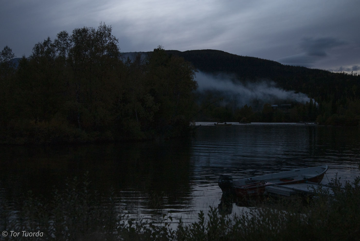 Trots vår gemenskap och lugn kommer mörka tankar. Jag vill inte låta dem påverka Nils. Han är för liten ännu. Det sticker i näsan av sur lukt från att någon bränner hö på Prästsidan. Röken går åt öster och lägger sig över hela deltat. Associerar med 1660-talet där första så kallade utvecklingen började. Smältning av ”silvermalm” vid Gamájåhkå. Då måste det har rykt mångfalt värre från kolmilor, rostugnar och stugor. Klockan närmar sig åtta och vi lämnar älven jag och min fiskeintresserade son och gör natt från vårt kvällsfiske i Kvikkjokk.